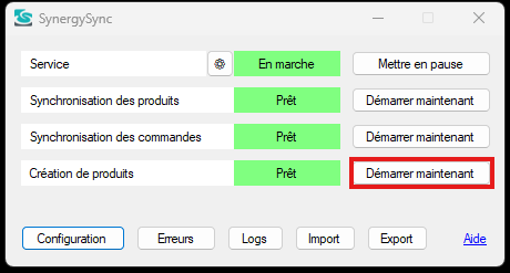 Pour démarrer manuellement une création de produits depuis votre système en magasin vers votre boutique en ligne, vous devez ouvrir l’interface SynergySync et cliquer sur Démarrer maintenant.