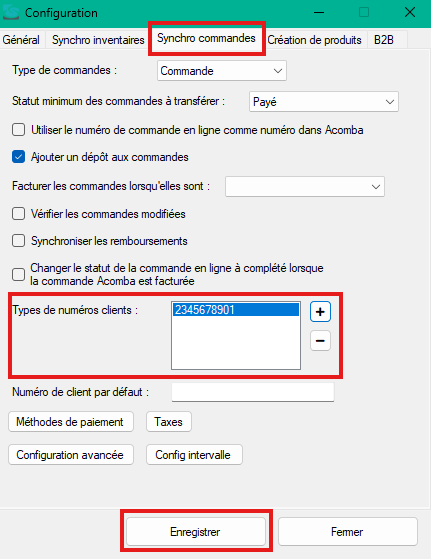 - Sous l’onglet Synchro commandes, vérifiez que le type de numéros clients correspond bien à ce qui est utilisé dans Acomba comme numéro client. Si ce n’est pas le cas, ajoutez le bon type de numéro en cliquant sur le bouton + et sélectionnez le bon format de numéro. Cliquez ensuite sur Enregistrer.
