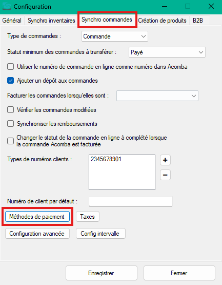 - Sous l’onglet Synchro commandes, cliquez sur Méthodes de paiement.