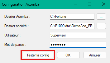 - Dans le champ Utilisateur, entrez le nom d’utilisateur valide. Ensuite, dans le champ Mot de passe, entrez le mot de passe valide. Cliquez sur le bouton Tester la config pour vérifier que la connexion se fait bien.